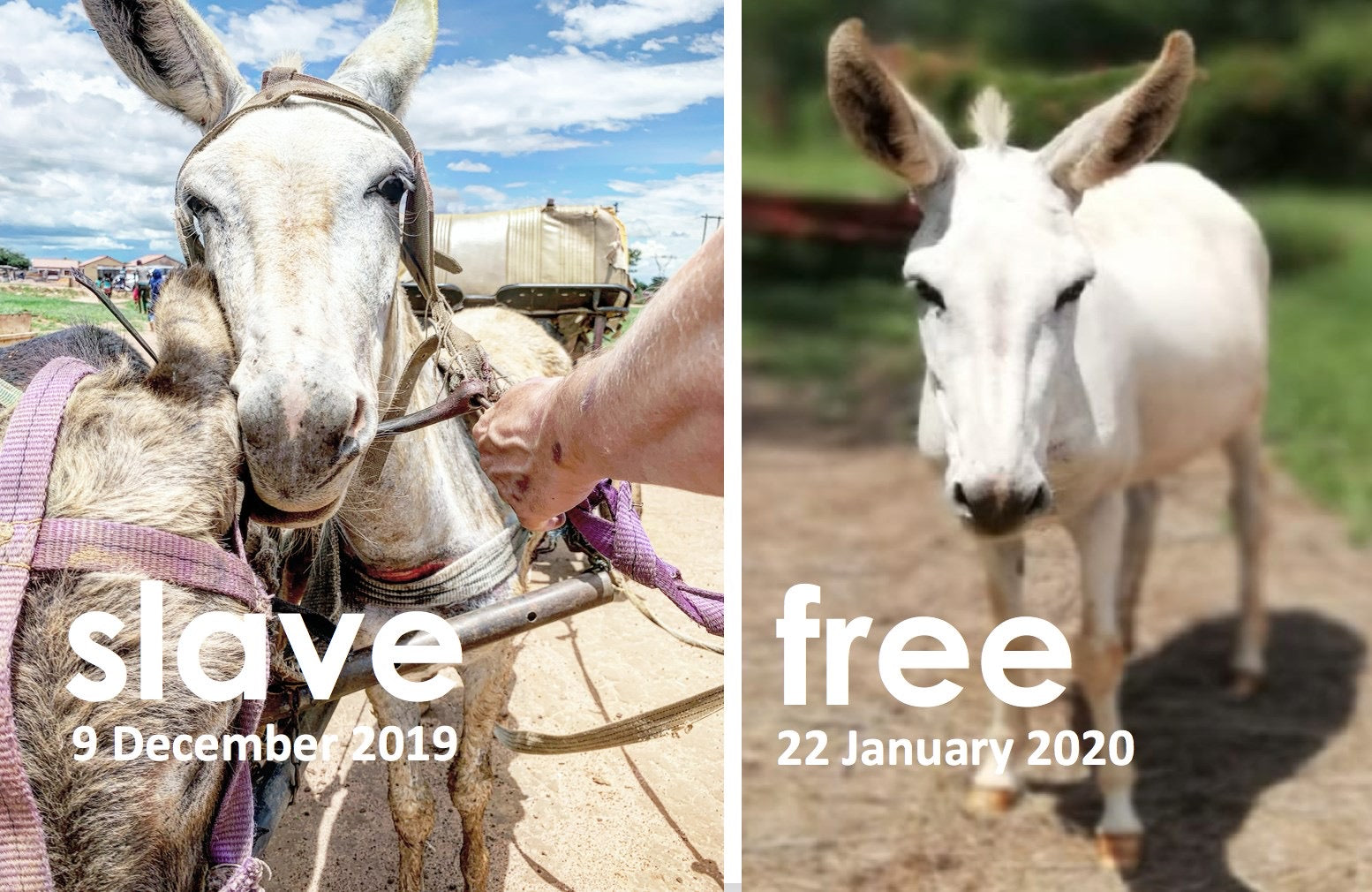 This beautiful lady was found shackled to a cart driven by a 15 year old child in rural Bela-Bela, Limpopo province. Exhausted, emaciated and covered in raw wounds from whip lashings and inhumane harnessing, Missy Sylvia was removed and relocated to a rehabilitation safe-house where she was later surrendered to us. Missy Silvia was re-homed and she is living her best life, surrounded by love and TLC with her guardians Lloreen and Albert (heart icon)