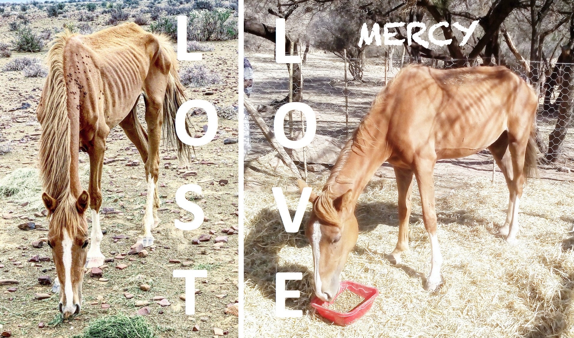 Mercy Following an extensive drone search, Mercy was found in a horrible condition and fighting for her life out in the vast, arid Karoo veldt, many miles from civilization. Infested with blood-sucking louse flies, Mercy had no food, no water and no shelter from the blistering desert sun. We relocated Mercy to the sanctuary where she received many months of critical care from our dedicated rehabilitation team. From death's doorstep to living her best life in our herd of rescues, Mercy is an example of the huge difference that we can make.